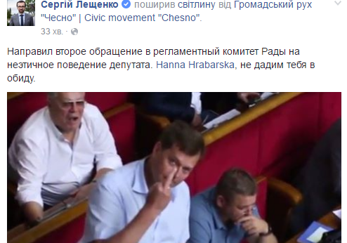 "Направил второе обращение в регламентный комитет Рады на неэтичное поведение депутата. Hanna Hrabarska, не дадим тебя в обиду", - написал депутат Лещенко.