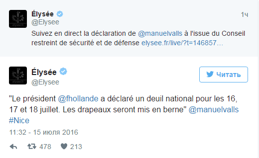 "Президент Франсуа Олланд объявил национальный траур 16, 17 и 18 июля. Флаги будут приспущены", - отмечают в сообщениях.