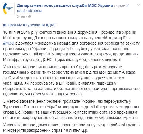 16 июля 2016 года в контексте выполнения поручения Президента Украины Министерству позаботиться о наших граждан на турецкой территории, в МИД состоялось межведомственное совещание для обсуждения безопасности и защиты прав граждан Украины в Турецкой Республике в контексте событий, происходящих в этой стране.