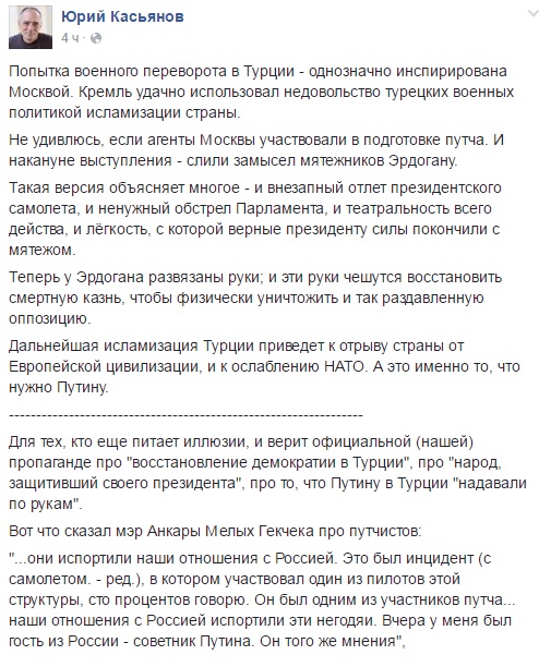Касьянов полагает, что он не удивится, если будет подтвержден факт участия кремлевских агентов в подготовке путча против режима Эрдогана. И вдруг, за несколько часов до начала слили данную информацию турецкому президенту.