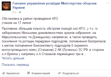 Пресс-служба Главного управления разведки Министерства обороны Украины разместила на официальной странице в Facebook информацию о новых потерях личного состава бандформирований и частей 1 АК (Донецк) и 2 АК (Луганск) ВС РФ.