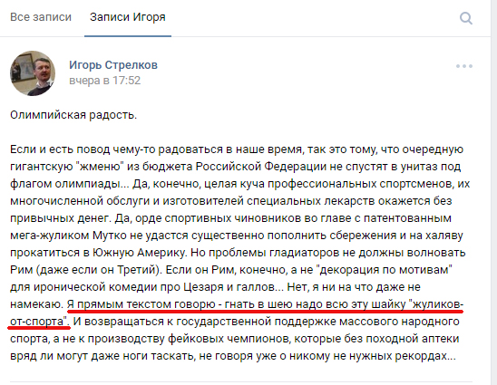 “Очередную гигантскую "жменю" из бюджета Российской Федерации не спустят в унитаз под флагом Олимпиады...”, - написал Стрелков в соцсети.