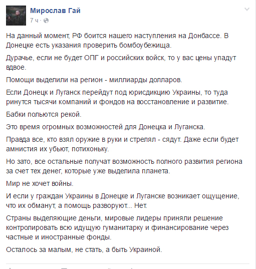 На своей странице в Facebook волонтер Мирослав Гай пишет, что обманутые наемниками мирные жители забыли, что если в их городах не будет боевиков, то цены на всю продукцию снизятся вдвое.