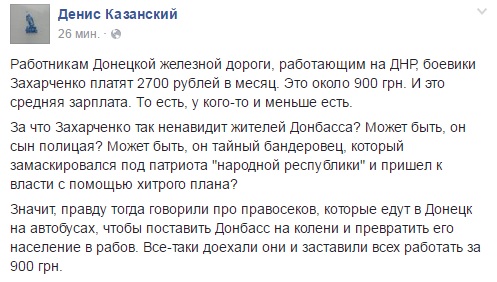 Значит, правду тогда говорили про правосеков, которые едут в Донецк на автобусах, чтобы поставить Донбасс на колени и превратить его население в рабов. Все-таки доехали они и заставили всех работать за 900 грн", - комментирует Казанский.