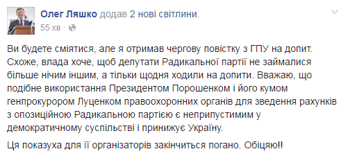 "Вы будете смеяться, но я получил очередную повестку из ГПУ на допрос. Похоже, власть хочет, чтобы депутаты Радикальной партии не занимались больше ничем другим, а только каждый день ходили на допросы. Считаю, что подобное использование Президентом Порошенко и его кумом генпрокурором Луценко правоохранительных органов для сведения счетов с оппозиционной Радикальной партией является недопустимым в демократическом обществе и унижает Украину. Эта показуха для ее организаторов закончится плохо. Обещаю!!", - заявил в своем аккаунте в соцсети Ляшко.