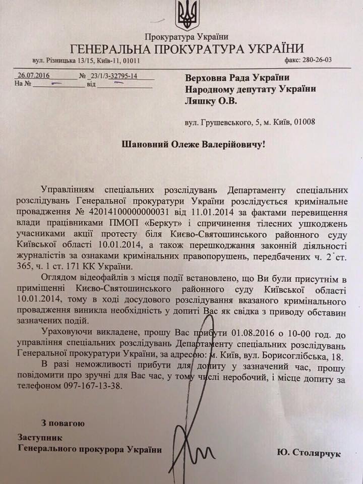 Управление специальных расследований Генпрокуратуры Украины в лице заместителя прокурора Юрия Столярчука прислало лидеру радикалов Ляшко приглашение на допрос в качестве свидетеля по делу превышения полномочий "беркутовцами", которые избили активистов во время протеста возле Киево-Святошинского районного суда и препятствовали работе журналистов на месте происшествия. Об этом написал Ляшко, прикрепив к тексту фото повестки.