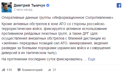Лидер группы "Информационное сопротивление" Дмитрий Тымчук сообщает в своем Facebook о подготовке широкомасштабного наступления российско-оккупационных войск на участке Донецк - Горловка.