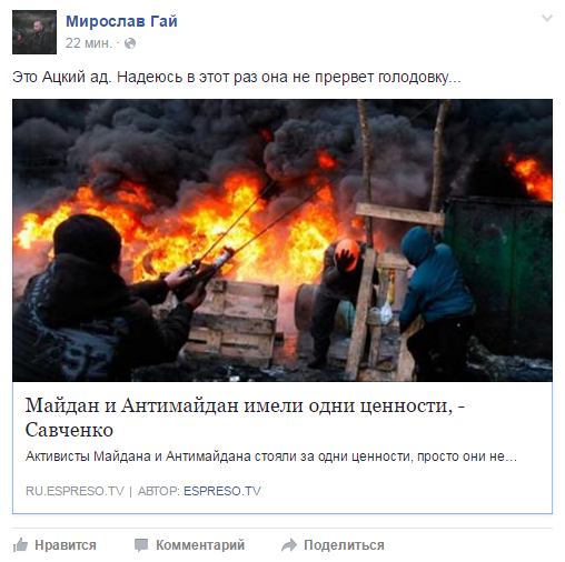 Волонтер Мирослав Гай неоднозначно прокомментировал громкие заявления парламентария Надежды Савченко относительно ценностей участников Революции достоинства на своей странице в Facebook.