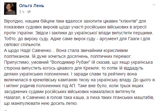 Вообще, в Савченко в голове такая каша, а гордость таких гигантских масштабов, что манипулировать ею довольно легко", - пишет Ольга Лень на своей странице в социальной сети Facebook.