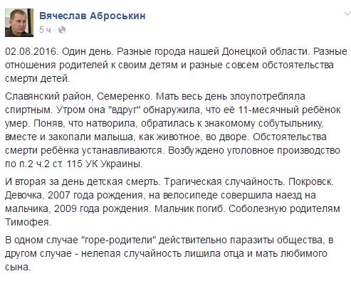 "Девочка 2007 года рождения на велосипеде наехала на мальчика 2009 года рождения. Мальчик погиб. Нелепая смерть. Вторая нелепая детская смерть за один день", - написал Аброськин.
