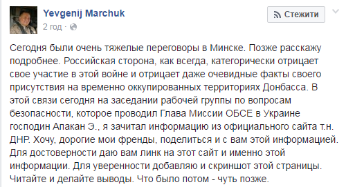 Марчук поведал на странице в социальной сети, что сегодня были очень тяжелые переговоры в Минске.