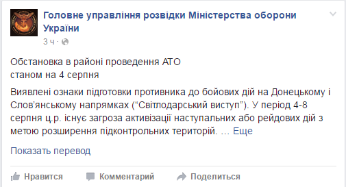 Пресс-центр Главного управления разведки Министерства обороны Украины в Facebook обнародовал сообщение о вероятной эскалации вооруженного конфликта на Донбассе .