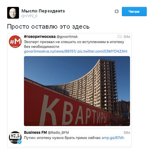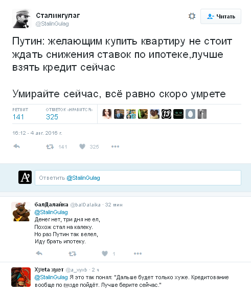 "Путин: желающим купить квартиру не стоит ждать снижения ставок по ипотеке, лучше взять кредит сейчас. Умирайте сейчас, всё равно скоро умрете", — пишут в Twitter Сталингулаг.