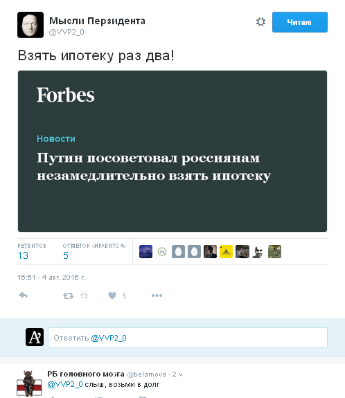 Чтоб показать некомпетентность главы российского государства, пользователь с ником «Мысли президента» дал ссылку на интервью специалиста, который объясняет, что сегодня для россиян не самое лучшее время брать на себя кредитное бремя. Иначе оно может стать обычной удавкой.