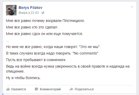 "Мне все равно почему взорвали Плотницкого. Мне все равно кто это сделал. Мне все равно сдох он или еще помучается. Но мне не все равно, когда наши говорят: "Это не мы". В таких случаях всегда надо говорить: "No comments". Пусть все пребывают в сомнениях. Ведь на войне всегда нужна уверенность в своей правоте и надежда на отмщение. Ну и чтобы боялись", - написал Филатов.