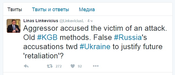 "Агрессор обвиняет жертву в нападении. Старые методы КГБ. Ложные обвинения России в отношении Украины чтобы оправдать "возмездие" в будущем?", - написал министр на своей странице в социальной сети "Твиттер".