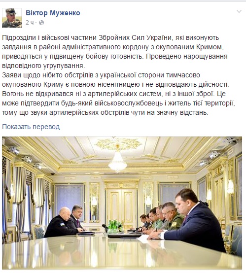 Как сообщает на своей странице в социальной сети Facebook начальник Генерального Штаба Минобороны Украины Виктор Муженко, в районе административной границы с захваченным Крымом украинские войска приведены в режим полной боевой готовности и готовы реагировать на вызовы.