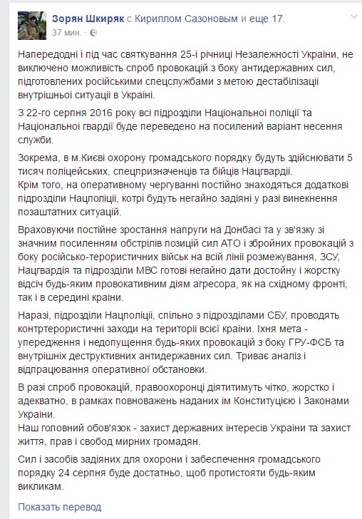 Советник главы МВД Украины Зорян Шкиряк сообщил, что с 22 августа все подразделения Нацполиции и Нацгвардии будут переведены на усиленный вариант несения службы. В Киеве на охрану правопорядка на улицы выйдет 5 тысяч полицейских.