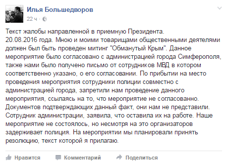 Власти РФ сорвали проведение законного митинга "Обманутый Крым" в оккупированном Симферополе и задержали его организаторов - атамана крымского казачества Сергея Акимова и председателя общественной организации "Крымский антикоррупционный комитет" Илью Большедворова.