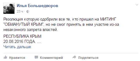 Однако организатор протеста председатель общественной организации "Крымский антикоррупционный комитет" Илья Большедворов обнародовал резолюцию митинга в своем Facebook.