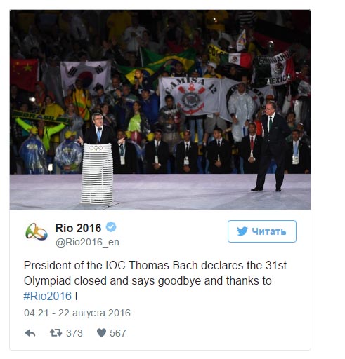 "После 16 славных олимпийских дней, теперь я должен выполнить свой последний служебный долг здесь, в Рио-де-Жанейро. Объявляю XXXI летние Олимпийские игры закрытыми”, - произнес Бах.