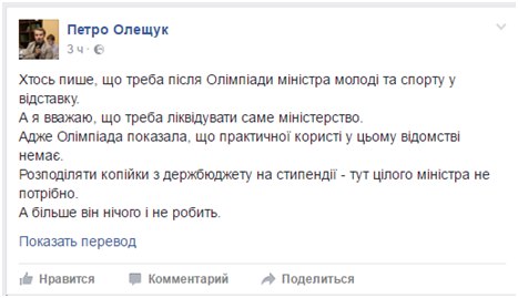 "Нужно не отправить в отставку министра молодежи и спорта, а ликвидировать само министерство," - Петр Олещук
