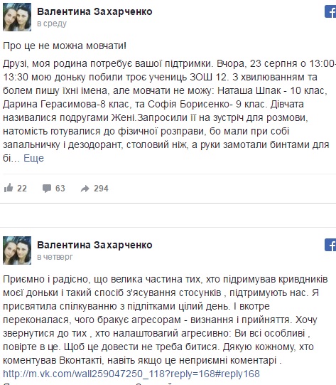 В Facebook мать пострадавшей Валентина Захарченко призналась, что поражена случившемся, ведь девушки дружили хорошо, неоднократно бывали в ее доме, а тут такое. Женщина утверждает, что девочки заранее все продумали и знали, что это будет именно физическая расправа, а не обычный разговор.