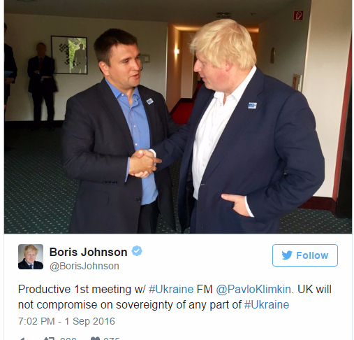 Об этом британский министр иностранных дел Борис Джонсон написал в Twitter после первой встречи с украинским министром иностранных дел Павлом Климкиным в рамках заседания глав внешнеполитических ведомств стран ОБСЕ в Потсдаме.