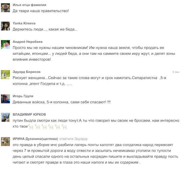 В социальных сетях местные жители публикуют ужасающие кадры разрушений. По словам жителей Приморского края, многие чудом спаслись из ушедших под воду домов. Но больше всего людей приводит в бешенство информация российских СМИ, которые утверждают, что пострадавших спасли МЧСники.