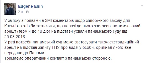 Чтобы прояснить ситуацию вокруг ареста Каськива и дать общественности правдивую информацию по поводу задержания в Панаме бывшего украинского чиновника, в Facebook заместитель генпрокурора Украины Евгений Енин написал о том, что Владислав Каськив судом Панамы арестован на 40 суток.