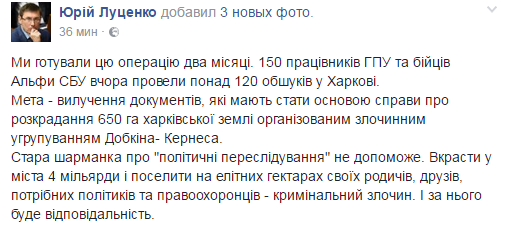 Руководитель Генеральной прокуратуры Украины Юрий Луценко прокомментировал сотни обысков в Харькове по делу о хищении группировкой бывшего и действующего мэра Геннадия Кернеса и Михаила Добкина.