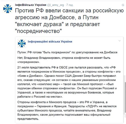 Через официальный аккаунт в Twitter, группа "Информационные войска Украины", которая была запущена при Министерстве информационной Украины, дала комментарий по поводу заявления президента России Владимира Путина. В нем речь шла о том, что российский глава якобы готов выступить в роли посредника по урегулированию ситуации на оккупированном Донбассе.