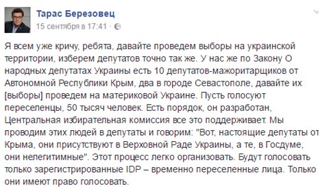 Известный украинский политтехнолог и политолог Тарас Березовец на своей странице в социальной сети Facebook поделился мнением о предстоящих выборах в российскую Госдуму в оккупированном Крыму. Также рассказал о своих предложениях должной реакции украинской стороны на данные незаконные деяние российской власти.
