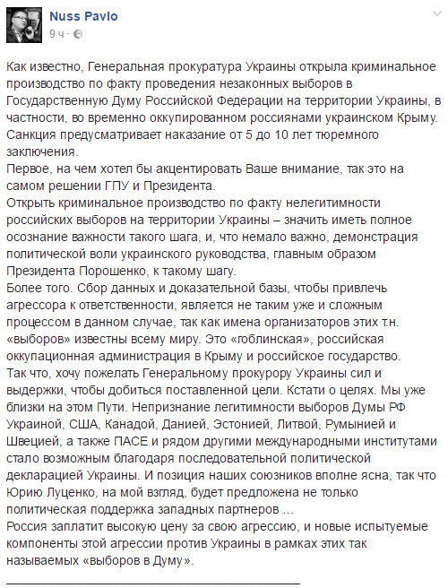 “Открыть криминальное производство по факту нелегитимности российских выборов на территории Украины – значит иметь полное осознание важности такого шага, и, что немало важно, демонстрацию политической воли украинского руководства, главным образом Президента Порошенко, к такому шагу”, - написал Нусс в соцсети.