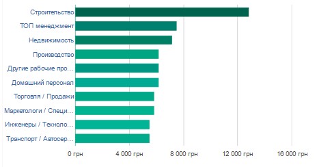 Ситуация с высокооплачиваемыми отраслями труда в городе отличается от стандартной. Здесь лидирует строительная сфера (12833 грн.), оставив далеко позади себя топ-менеджмент (7500 грн.) и недвижимость (7167 грн.).