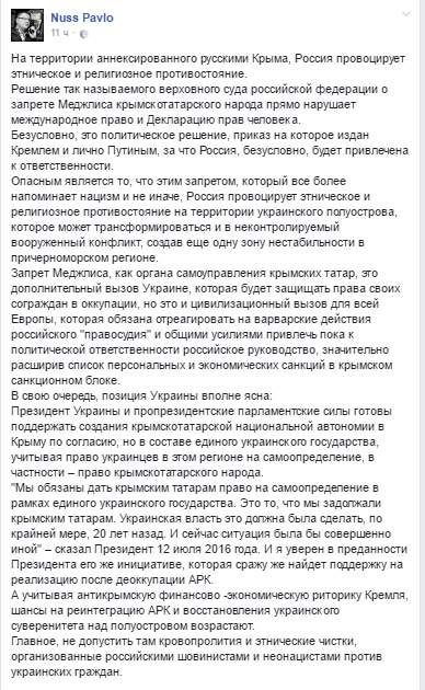 Решение Верховного суда РФ о запрете Меджлиса крымско-татарского народа в аннексированном Крыму прямо нарушает международное право и Декларацию прав человека. Таким образом, Кремль провоцирует на полуострове этническое и религиозное противостояние, которое может перерасти в неконтролируемый конфликт.