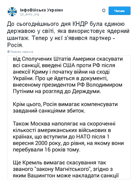 В Мининформполитики инициативу Путина назвали "ядерным шантажом", добавив при этом, что Россия теперь стала на одну ступеньку с КНДР, которая также шантажирует ядерным оружием весь мир.