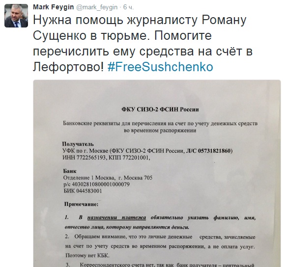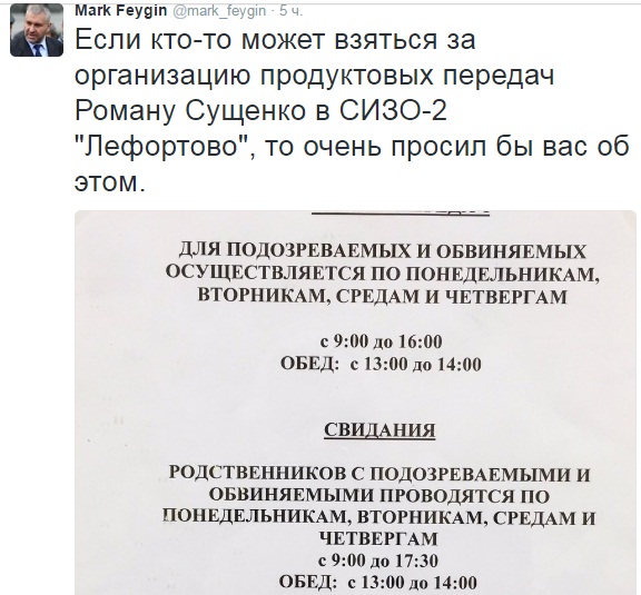 Адвокат задержанного российскими спецслужбами украинского журналиста Романа Сущенко Марк Фейгин не может попасть к своему подзащитному с 09.00 5 октября. Фейгин призывает всех, кто может оказать журналисту посильную помощь, принести в "Лефортово" для него продукты питания или же перечислить деньги на его счет.