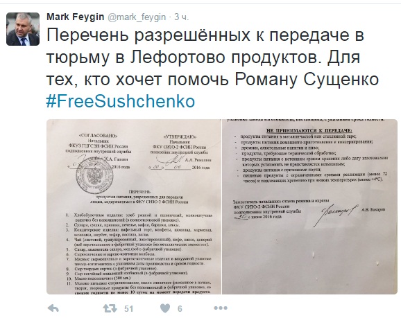 "Если кто-то может принять участие в организации продуктовых передач Роману Сущенко в СИЗО "Лефортово", я бы очень просил вас об этом", - сообщил адвокат.