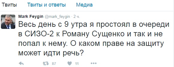 В микроблоге Twitter Марк Фейгин рассказал, что с девяти утра занял очередь на посещение, но так до сих пор и не попал к журналисту.