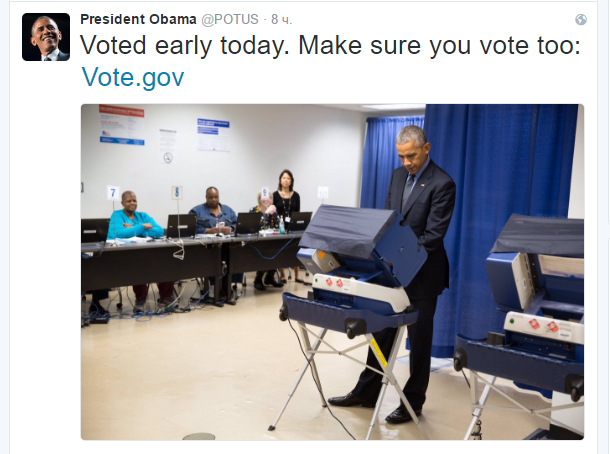 Накануне глава Белого дома Барак Обама досрочно проголосовал на выборах президента США. Об этом он сообщил в своем Twitter.