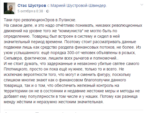 По словам Шустрова, очень многие люди знают о слишком благополучном финансовом положении Плотницкого и его неспособности обеспечить “железный контроль на территории”.