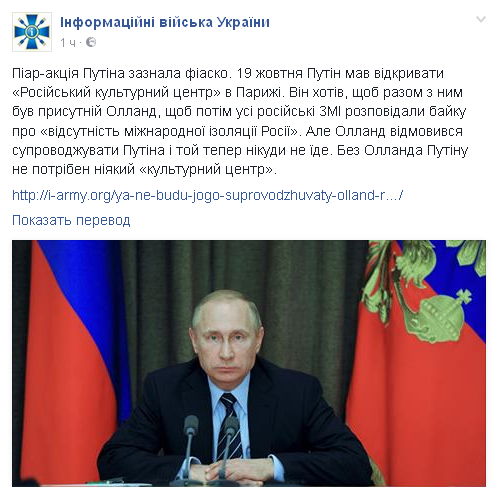 "Без Олланда Путину не нужен никакой "культурный центр", — заключают в Информвойсках.