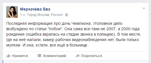 Стоит отметить, что до сих пор поступает противоречивая информация относительно избиения дочери Федора Емельяненко. Один источник сообщает, что полиция факт избиения официально не подтвердила, другой – что по факту избиения дочери Емельяненко возбуждено уголовное дело по статье "Побои" (Статья 116 УК РФ).
