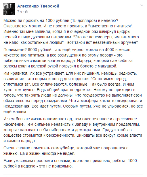 “Именно так мне заявили, когда я в очередной раз швырнул цифры пенсий в лицо духовным патриотам. "Это же пенсионеры, им так много не надо, как остальным людям" - вот такой вот незатейливый аргумент. Понимаете? 8000 рублей - это еще жирно, можно на 4000 в месяц качественно питаться, а все возмущения по этому поводу - это либеральные замашки врагов народа. Народа, который сам себя за волосы взял и волевой рукой погрузил в болото с макушкой”, - возмутился Тверской.