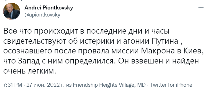 "Все, что происходит в последние дни и часы, свидетельствует об истерике и агонии Путина, осознавшего после провала миссии Макрона в Киев, что Запад с ним определился. Он взвешен и найден очень легким", - отметил эксперт.