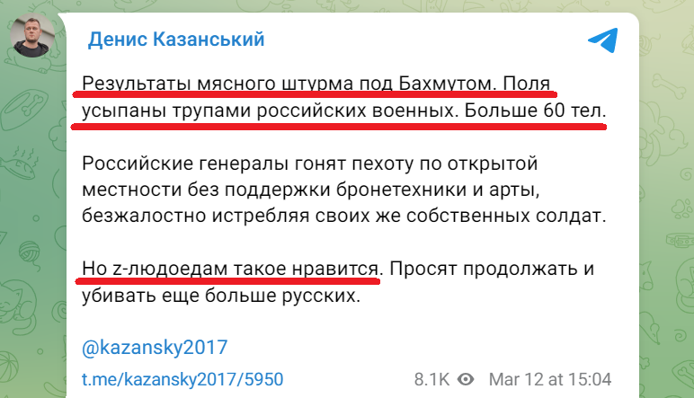 Напомним, в бессмысленном штурме украинского Бахмута Россия несет колоссальные потери.