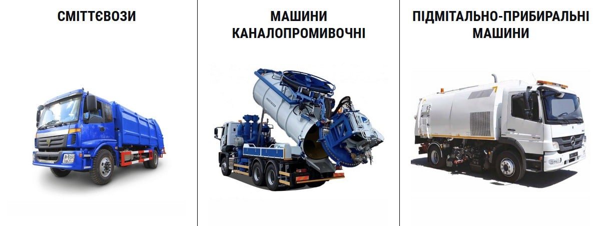 - -Сміттєвози та підмітально-прибиральні машини — основа чистоти міських вулиць.