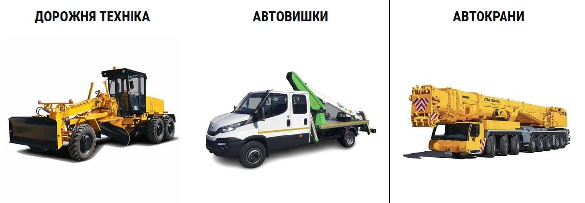 - -Автокрани, крани-маніпулятори, автовишки, навантажувачі, трактори, екскаватори, автоцистерни, автобуси, генератори, причепи — усе, що потрібно для будівництва, транспортування та сервісних робіт.