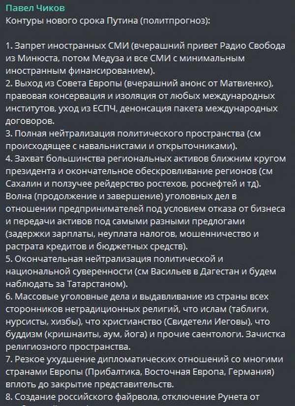 Это должен прочесть каждый россиянин! Член СПЧ при президенте РФ Чиков озвучил шокирующий политический прогноз на новый президентский срок Путина